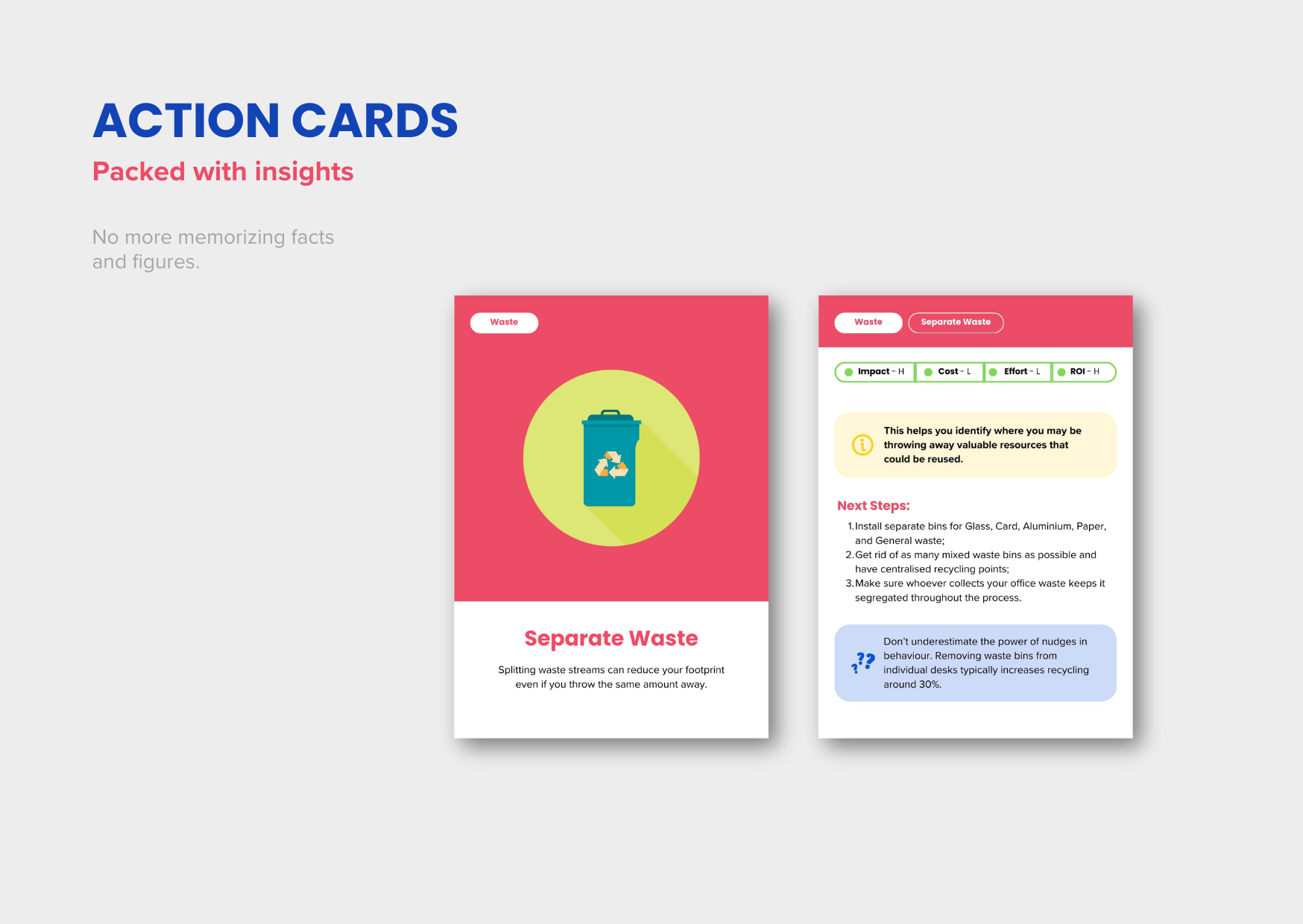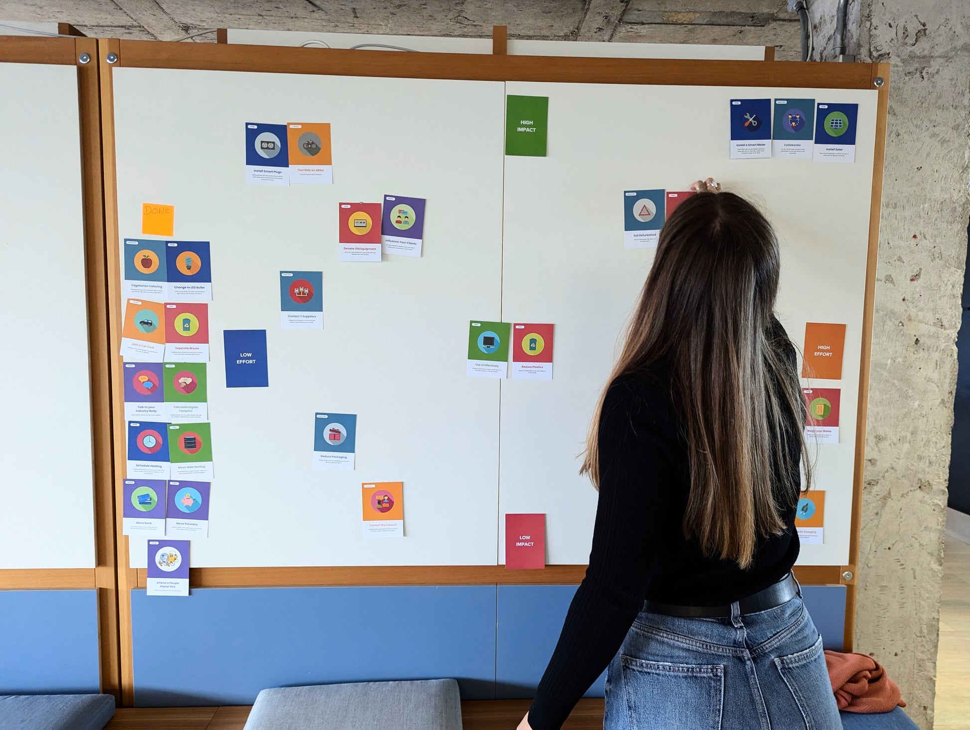 - A deck of 50+ action cards, categorised by impact and effort.