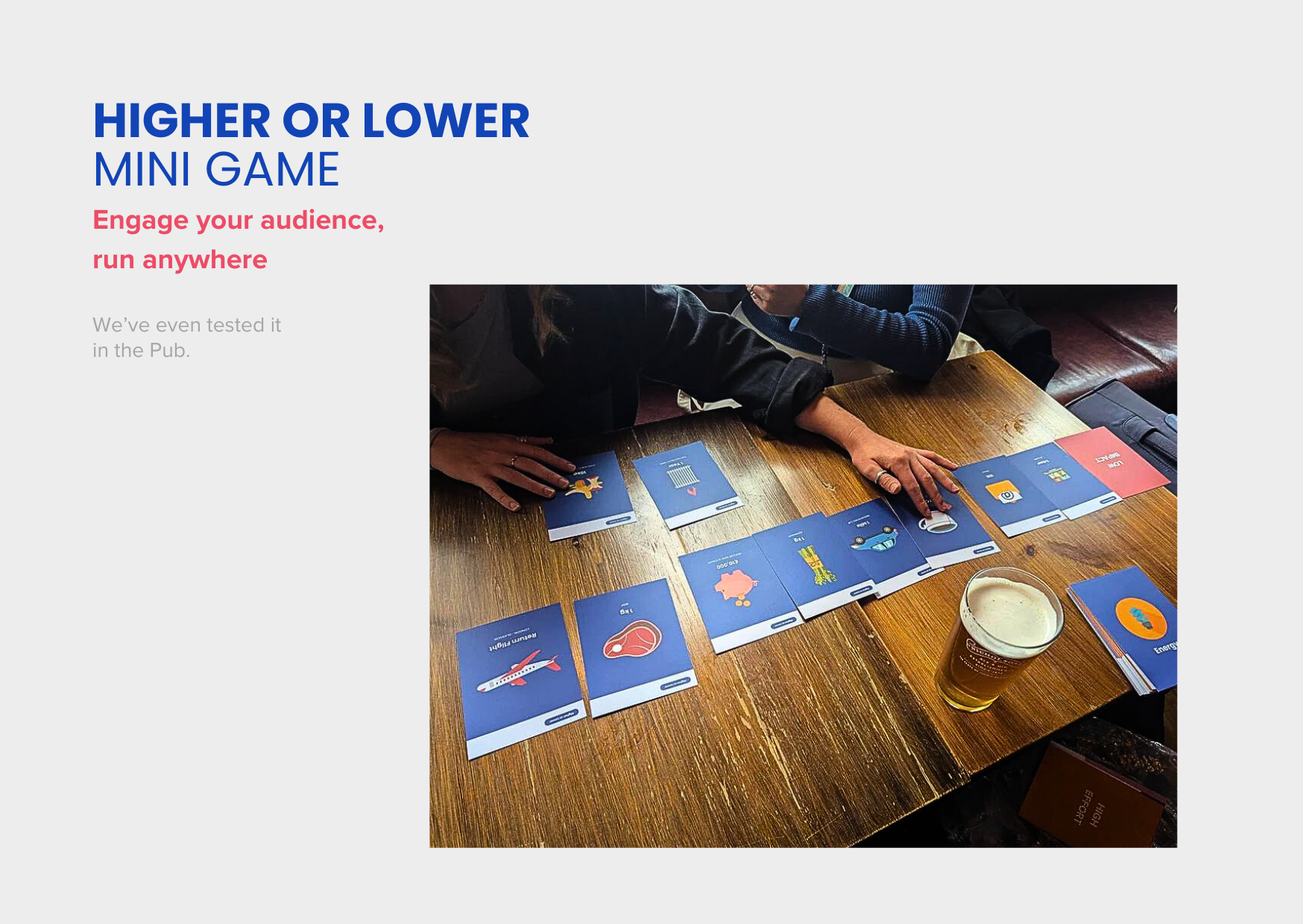 I think that it has huge potential and is a great idea... I think it is overpriced for the mass market with respect to other board games available. I also think there are some quick addons and adjustments that would make it much better... Happy to talk to Val or Adam when they have time... We are doing a run through on Monday so will have more feedback then. We would like to share our ideas with you... Sadly my box weas delayed and when it arrived the box was broken! But you had kindly included the beautiful Pub in a tin game as well... WE also have ideas about the Pub version to make it go further... Best regards Debbie